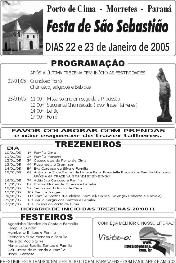 É com satisfação que convidamos V.Sa. para participar da tradicional Festa de São Sebastião de Porto de Cima em Morretes , conheça a Igreja Centenária (155 anos) tombada pelo patrimônio histórico, dias 22 e 23 de janeiro de 2005, conforme programação em anexo.
